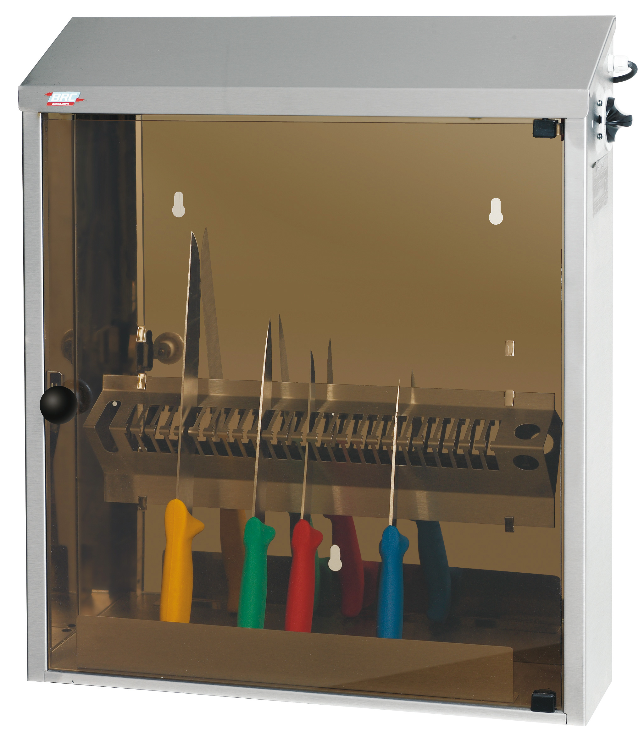 Capacité de 20 couteaux – 1 lampe UVC économique (8000h), Support panier amovible. Finition inox 304 – Porte plexifumé transparent -Toit penté – Minuterie 0-2 heures. Sécurité à l’ouverture de la porte. Fermeture magnétique.