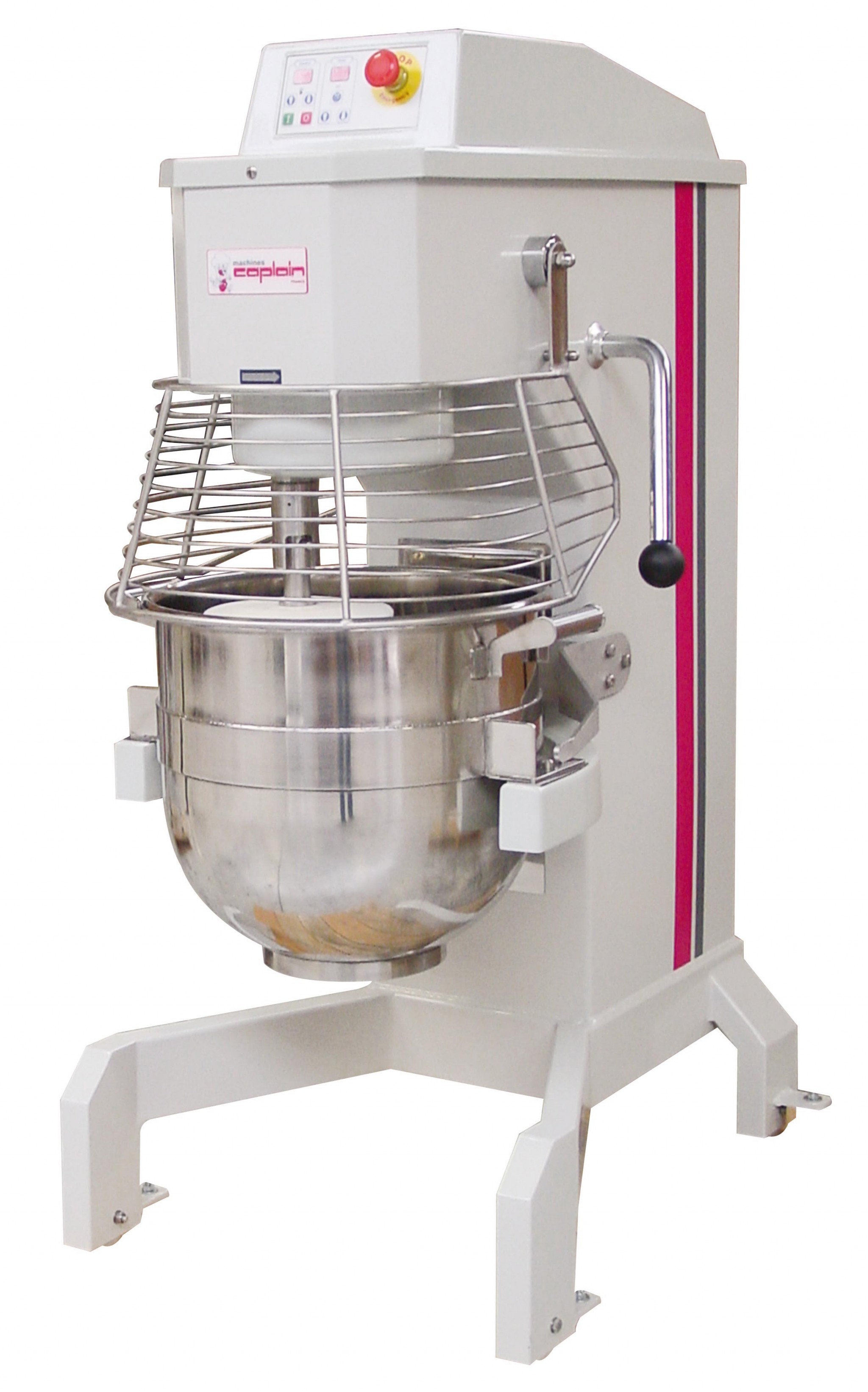 batteur mélangeur à variateur de vitesse 20 vitesses présélectionnées minuterie capacité de cuve : 40 litres cuve renforcee livré avec 1 cuve et 3 outils (fouet+palette+crochet) blocage de cuve levage de cuve par levier grille de sécurité relevable bec verseur sur grille roulettes fixes