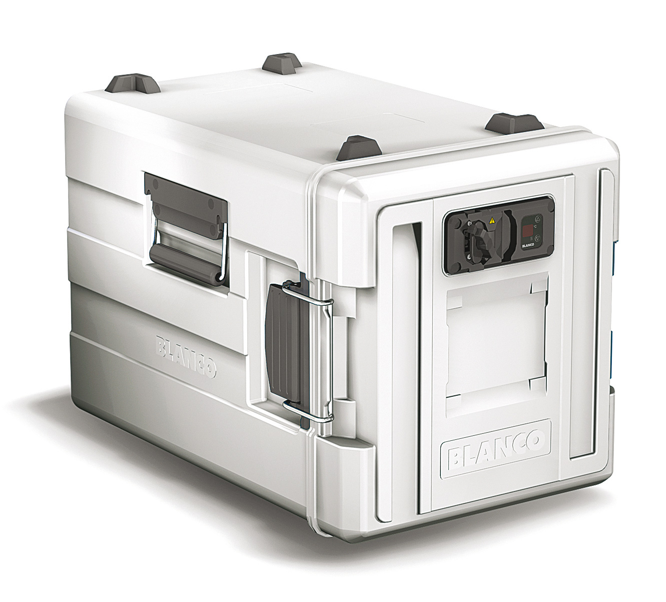 Caisson de transport de repas en polypropylène chauffé par air pulsé avec thermostat, numérique pour la régulation précis (Degré près) – Température à l’intérieur de l’appareil de +40°c a +85°c, avec porte battante – Capacité : 2 GN 1/1 – 11 paires de glissières – Écartement : 31mm