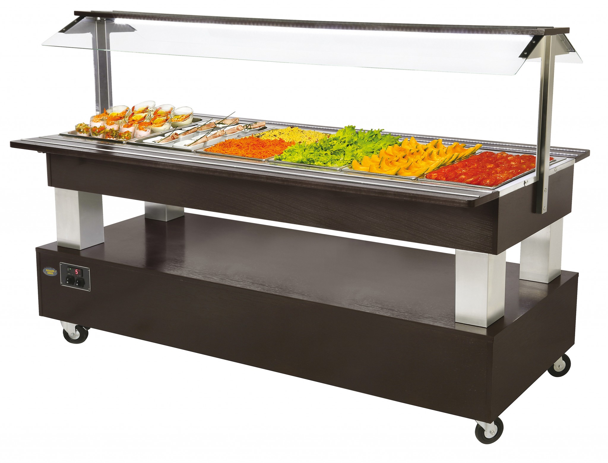 Buffet 6 bacs GN réfrigéré (+2°/+10°C) pour plats froids. Froid de conduction grâce à lépingle en contact avec la cuve inox. Gaz R134A sans CFC. Compresseur U.H./Danfoss. Construction bois (Menuiserie française), pare-haleine en verre, profilé alu sur tablettes démontables, 4 roues dont 2 avec freins. Thermostat électronique. Éclairage LED blanc-froid. Livré sans bac. Structure bois Wengé. Disponible aussi chêne clair, acajou, ou blanc cérusé.
