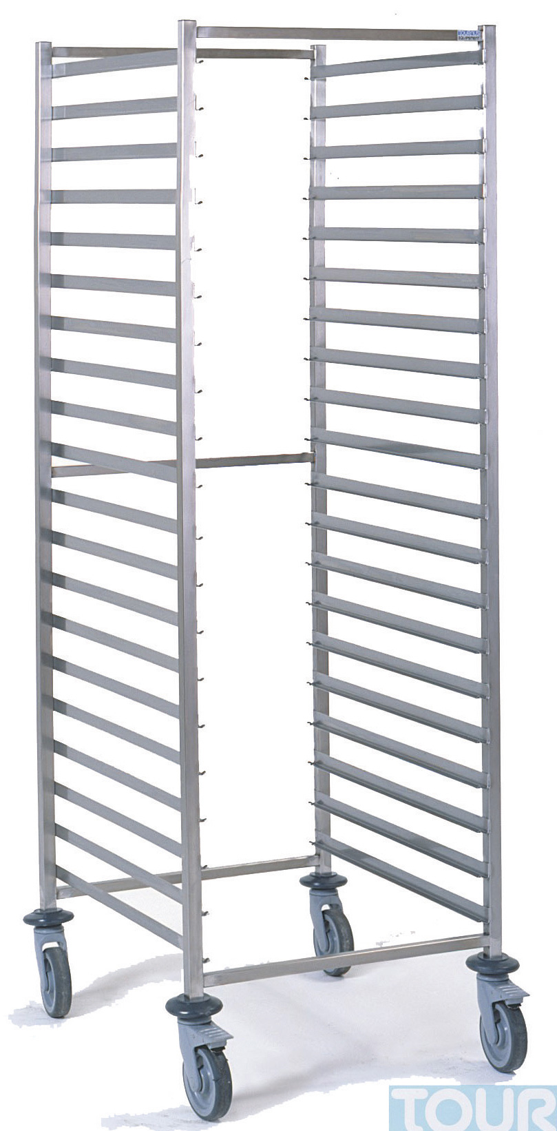 Chariot GN 2/1 soudé, 20 niveaux espace 77 mm roues à chape polyamide construction soudée inox tube 25 x 25 mm glissières soudées argon avec butées d’arrêt en extrémité 4 roues pivotantes diam 125 mm dont 2 à frein, axes et billes inox