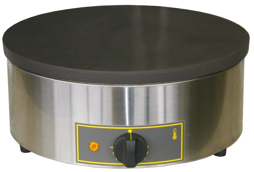 Crêpière électrique haut rendement encastrable. Plaque en fonte émaillée Ø 400 mm lisse pour un parfait transfert de température : 1. Phase de culottage très réduite (crêpière opérationnelle dès la 3ème crêpe) 2. Réelle économie d’énergie: cuisson à 200°C au lieu des 240°C recommandés sur une plaque en fonte pure 3. Haut rendement: 60 crêpes / h ! Equipement : résistance en spirale intégrée sous la plaque, thermostat 0-300°C,