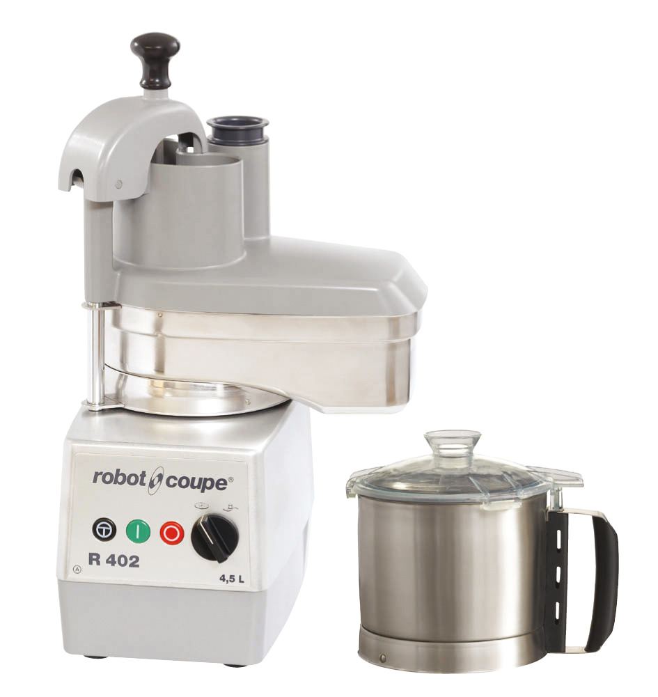 Combiné cutter/Coupe-légumes R402. . Monophasé 230V. Puissance 750W. 2 vitesses 500 et 1500tr/mn, Livré avec une cuve cutter de 4,5 litres en inox avec poignée et Couteau lisse fond de cuve inclus, Couvercle Coupe-légumes à ejection avec cuve en inox et couvercle en matériau composite composé de 2 goulottes : 1 goulotte demi-lune et une goulotte cylindrique. Livré sans disque.Collection complète de 28 disques en inox disponible,