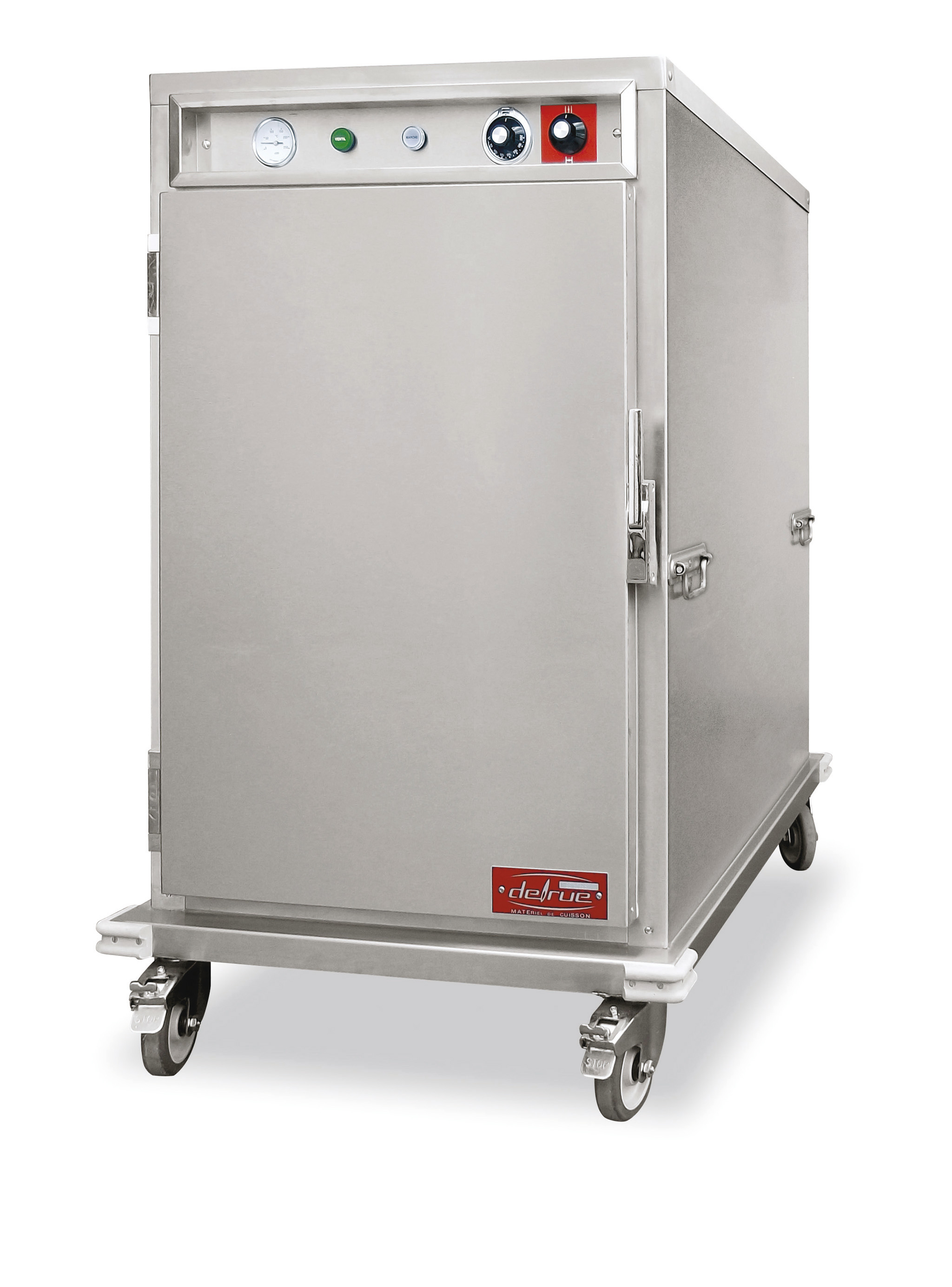 Chariot chauffant ventilé isolé de 12 étages GN2/1 espacés de 70mm pour maintien en température. Oura pour gestion manuelle de l’humidité Construction, bâti tubulaire en acier inoxydable Isolation renforcée Commandes en façade:thermostat 60-200°, voyants et thermométre Socle de protection avec butoirs en caoutchouc Agencement intérieur mobile pour faciliter l’entretien