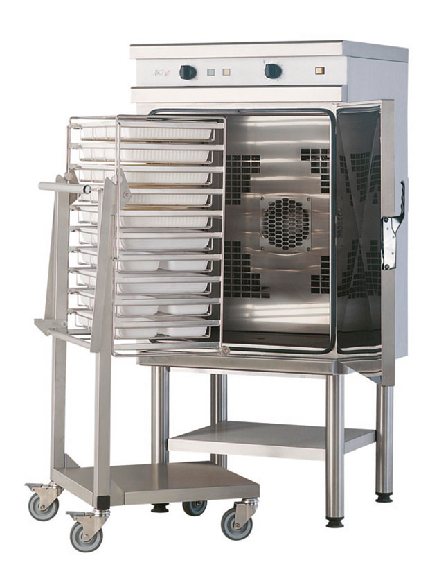 FOUR DE REMISE ET MAINTIEN EN TEMPERATURE 10 Niveaux GN1/1 : 530 x 325 mm au pas de 67 mm. – Nbre repas maxi : 120. – Commande à régulation électromécanique. Habillage et moufle intérieur acier inox. Minuterie 120 mn, thermostat multipoints, thermostat de sécurité, programme frite intégré. Oura d’évacuation et tiroir de récupération des condensats. Support de four intégré. – Conforme à la norme NF HYGIENE ALIMENTAIRE.
