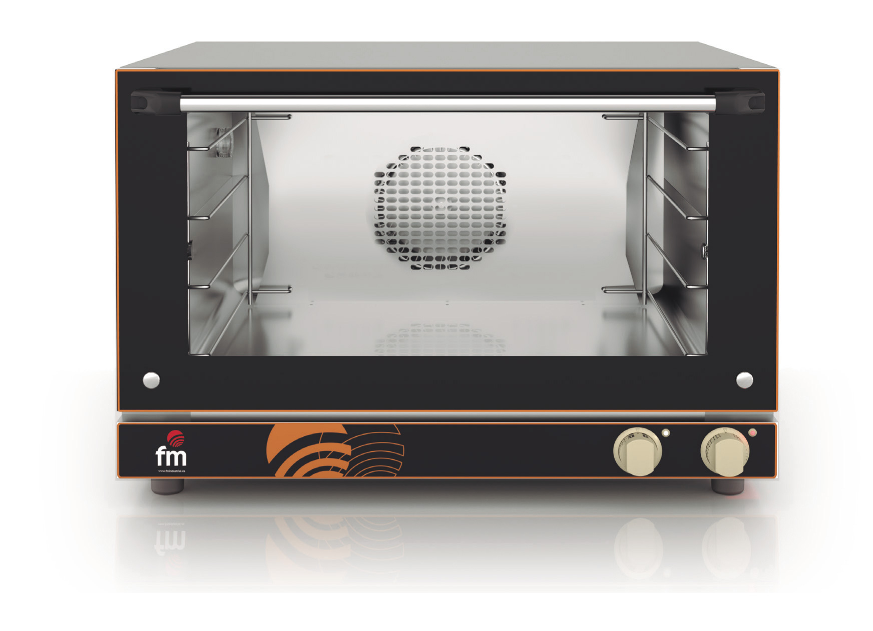 Four à air pulsé – Intérieur et extérieur inox – Système électromécanique avec humidificateur (actionné par bouton pression branché sur le réseau d’eau. Projection d’eau sur la résistance du four) – Capacité : 4 GN1/1 ou 600×400 – temp. de 50°C à 250°C – Dimensions intérieures : 620x450x350 – Rack démontable pour nettoyage facile – Thermostat de sécurité – Minuterie : 0 à 120 mn et mode continu – Lumière intérieure – Porte double vitrage – 75mm