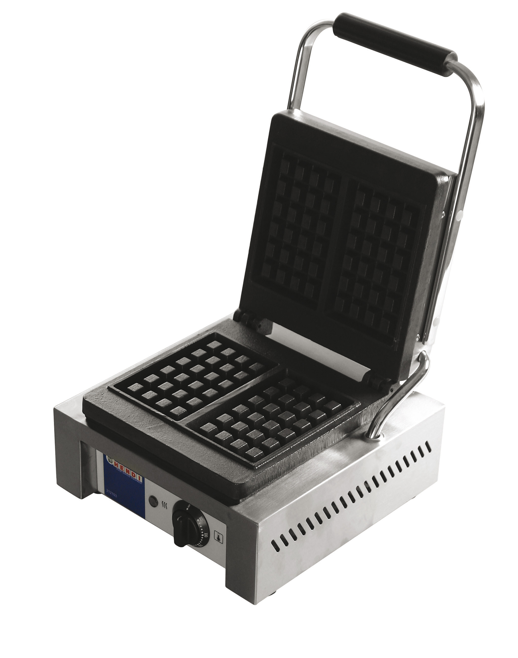 Gaufres de Liège, motif de deux 4×6 carrés. Plaques à cuisson en fonte avec couche anti-adhésif. Régulation température thermostatique. Livré avec une fourchette à gaufres. Poignée isolante. Egouttoir amovible. Inox480x320x(H)226 mm 28kg