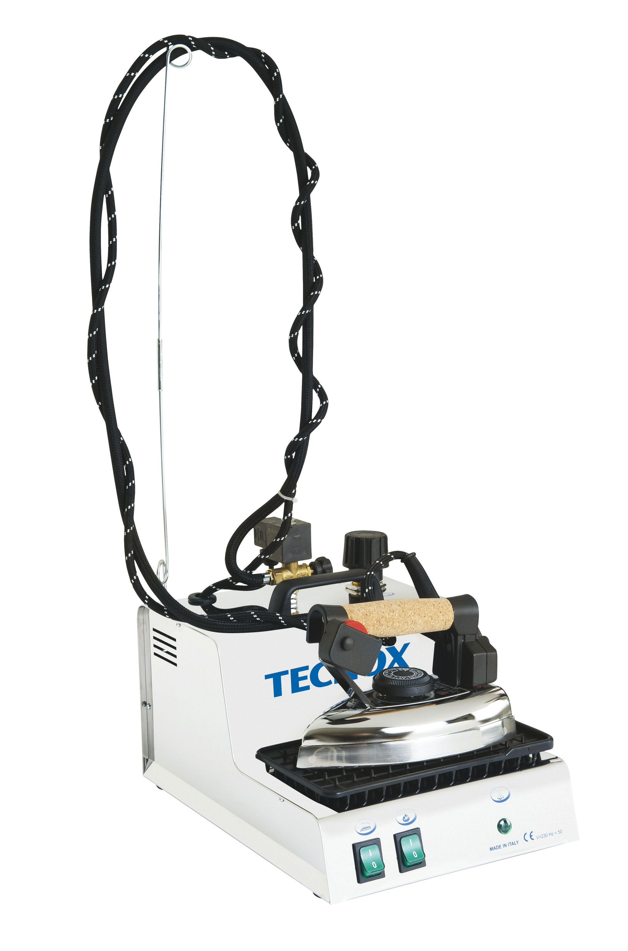 Puissance chaudière 1300 W . 1 fer à repasser vaporisant . Remplissage manuel. Temoin de fin d’eau. Carrosserie Blanche .