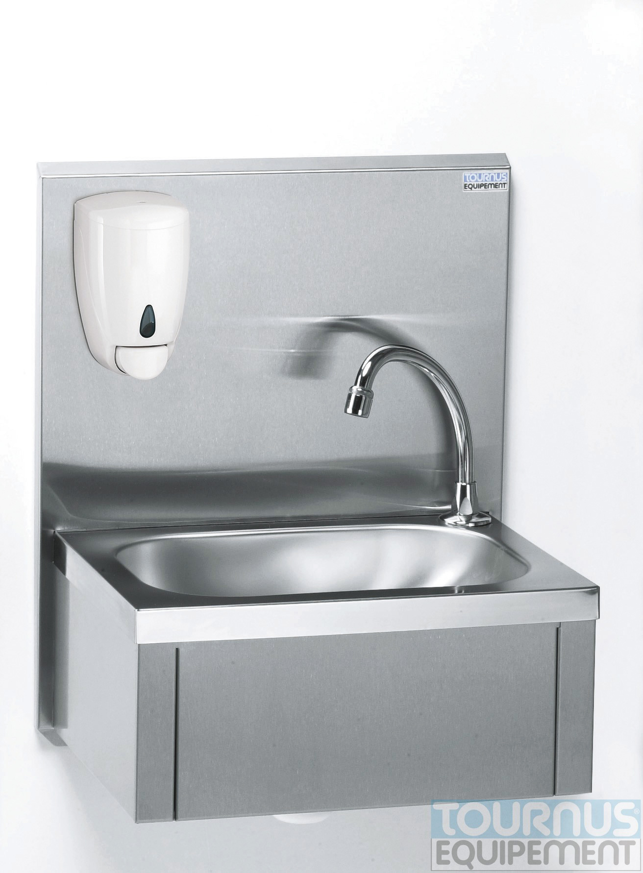 Lave-mains GC avec dosseret hauteur 540 mm et distributeur de savon liquide bac 345 x 245 x 120 mm commande au genou avec temporisation bec col de cygne haut. 150 mm avec aérateur réglage de la température par 2 robinets d’alimentation EC-EF, munis de clapets anti-retour accessibles sous la palette de commande