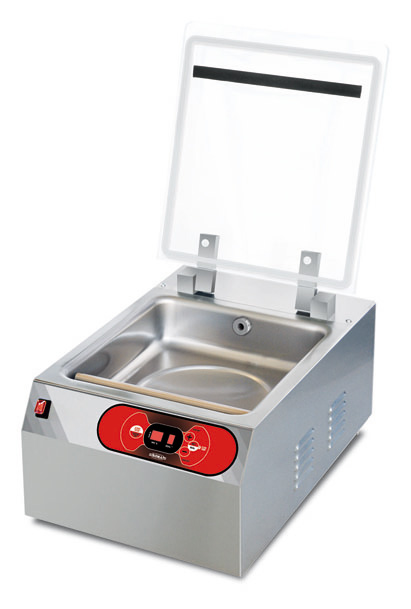 Machine sous vide à cloche de table; commandes digitales avec 1 programme; possibilité de régler le % de vide et le temps de soudure; Démarrage manuel du cycle de travail et réouverture manuelle du couvercle. Pompe à bain d’huile. Fonction GASTRO VAC