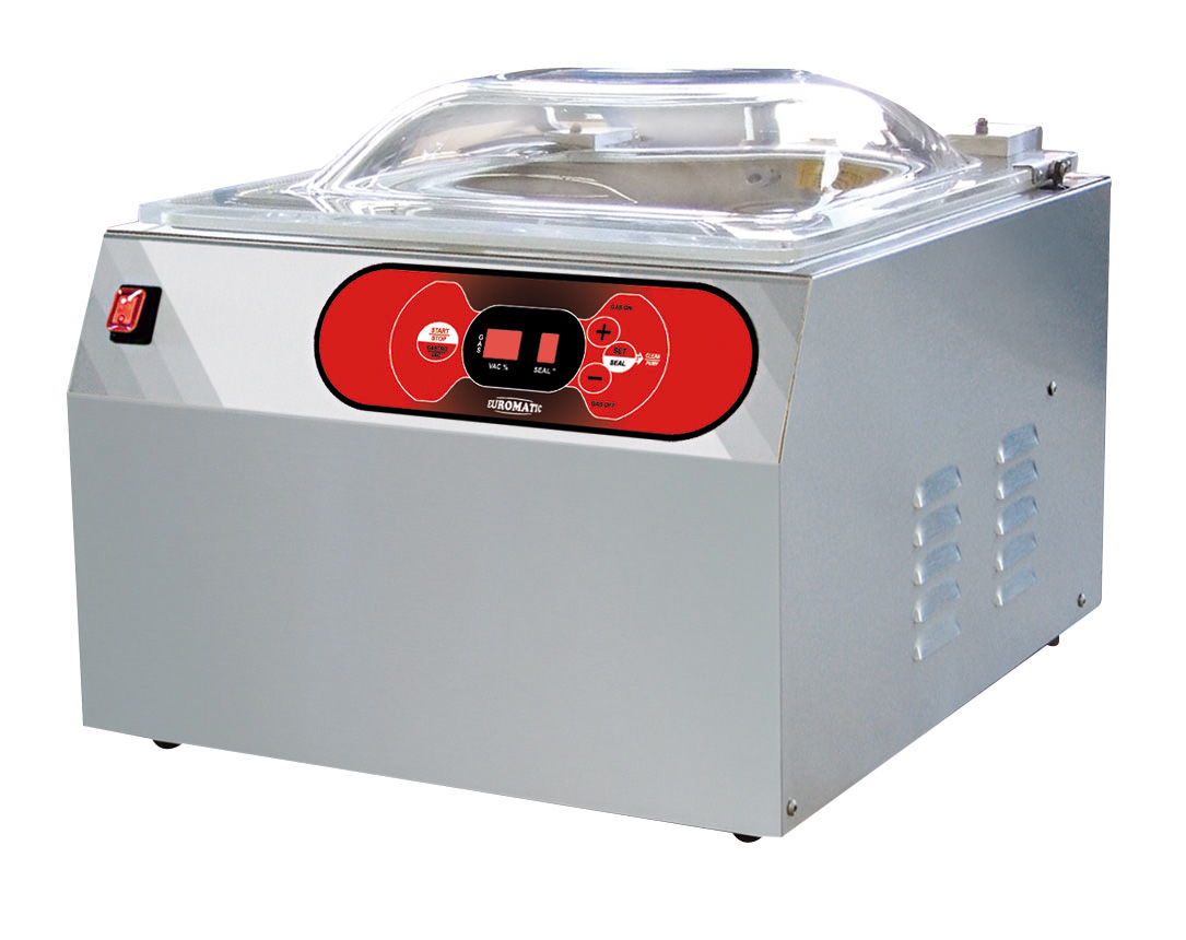 Machine sous vide à cloche de table; commandes digitales avec 1 programme; possibilité de régler le % de vide et le temps de soudure; Démarrage manuel du cycle de travail et réouverture manuelle du couvercle. Pompe à bain d’huile. Fonction GASTRO VAC