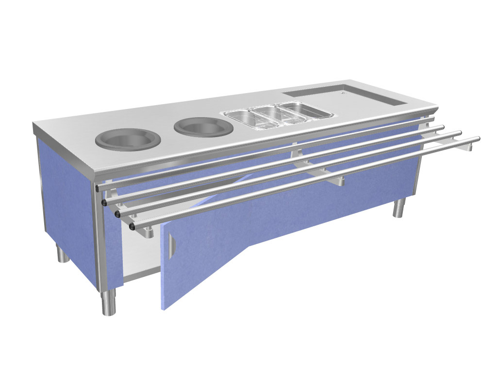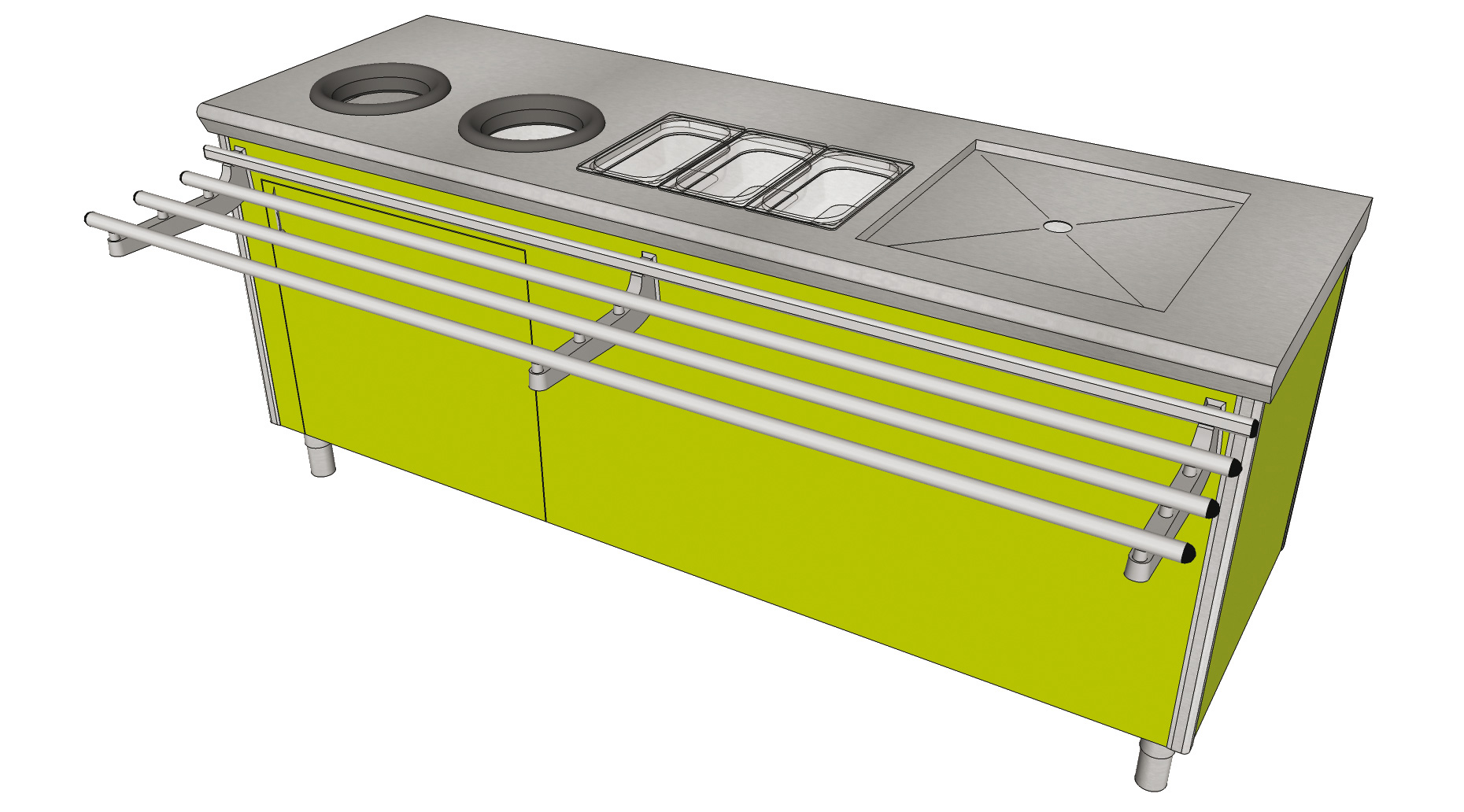 2 trous vide déchets + collerette Porte battante sous la rampe permettant l’accès aux sacs 1 découpe avec 3 bacs poly GN1/3-150 1 décaissé pour casier fond pointe de diamant + évacuation livré avec rampe à plateaux et habillage mélaminé sur 3 faces destiné à être disposé contre un mur dessus inox ép.15/10e mm habillage côtés et avant
