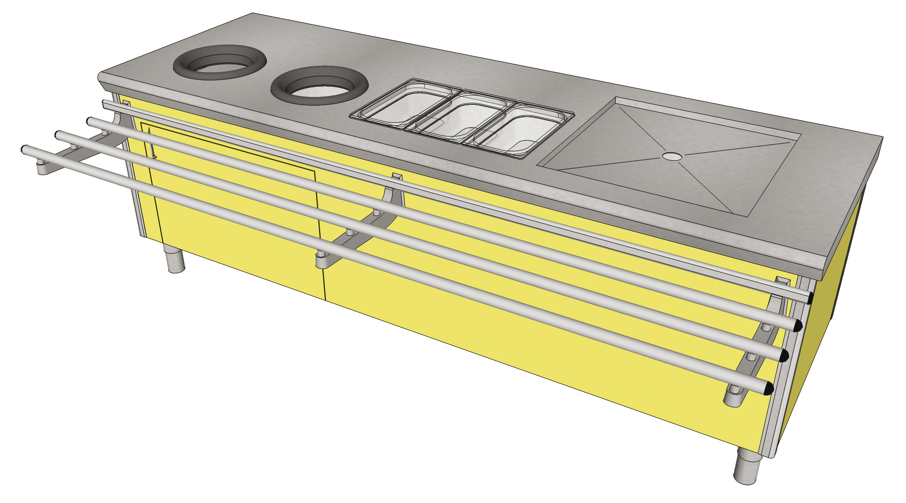 2 trous vide déchets + collerette – Porte battante sous la rampe permettant l’accès aux sacs – 1 découpe avec 3 bacs poly GN1/3 – Décaissé pour casier – Fond pointe de diamant + évacuation, Livré avec rampe à plateaux et habillage mélaminé sur 3 faces destiné à être disposé contre un mur – Dessus inox ép. 15/10.