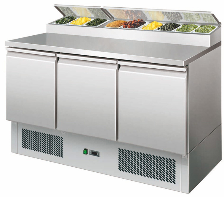 Table de préparation réfrigérée 3 portillons Plan de travail inox, profondeur utile 304 mm. Porte bac réfrigéré capacité 7 bacs GN 1/3, prof. 150 mm, livré sans bacs. Froid statique + 1 petit ventilateur, température +2°C +8°C. Gaz réfrigérant R134a Extérieur et intérieur tout inox, sauf arrière. Affichage digital, isolation 35 mm Dégivrage et réévaporation