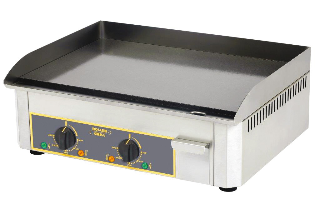 Plaque de cuisson en acier (10 mm) chromé. Revêtement chromé par polissage. Surface lisse pour cuisson par contact. Cuisson saine rapide et homogène sans perte de chaleur en périphérie grâce aux résistances Incoloy en serpentin. 2 zones indépendantes de cuisson. Surface utile : 600 x 400 mm. Evacuation du jus et des graisses dans le tiroir amovible (1L). Puissance: 6 kW (380 V triphasé).