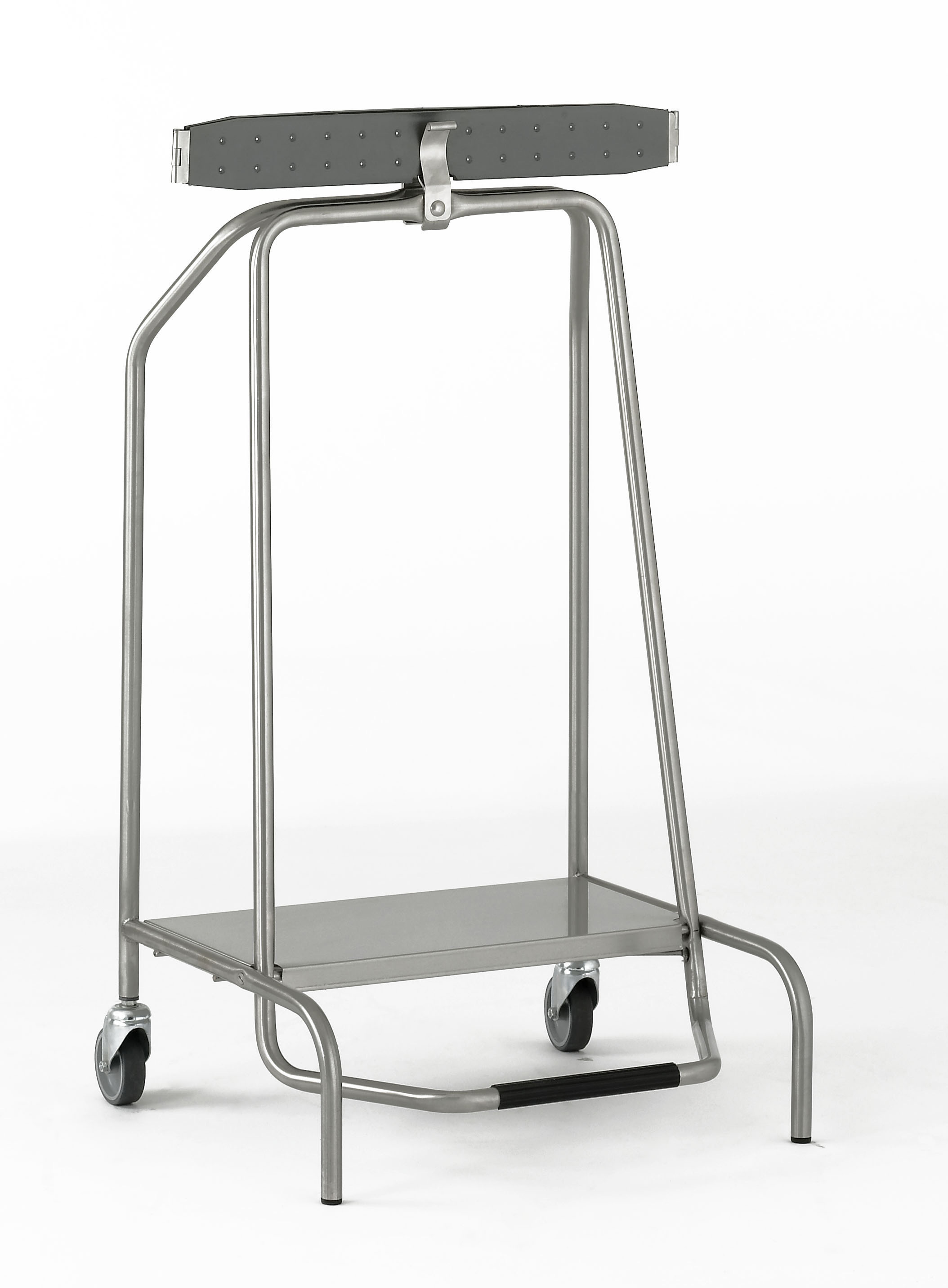 Pour sacs de 100 litres – 2 roues à chape acier électrozinguée diam. 80 mm – Structure en tube inoxydable diam. 20 mm – Pince constituée de 2 mâchoires inox avec revêtement caoutchouc – Ouverture à commande par pédale socle inox pour le support du sac