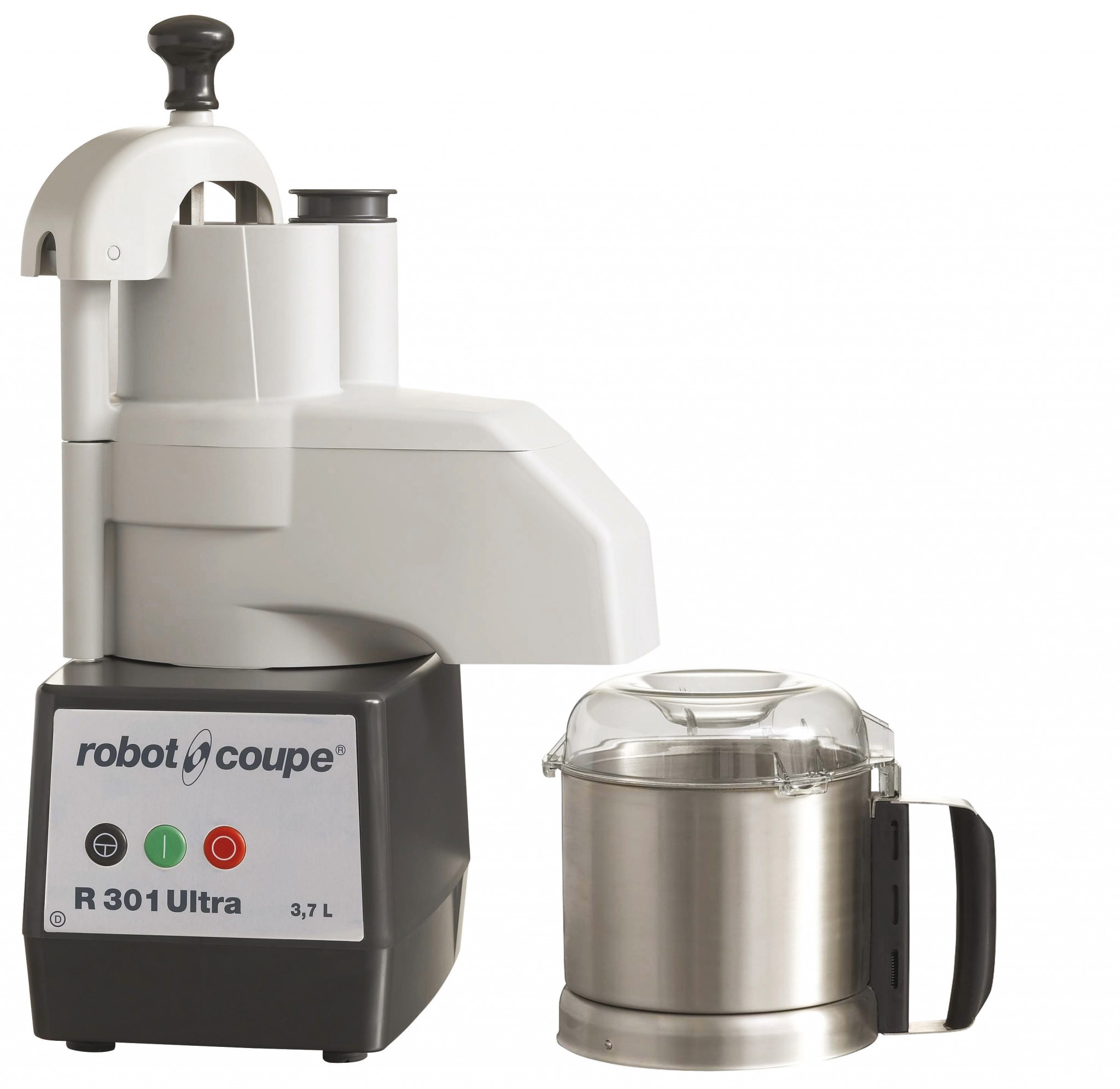 Combiné cutter/Coupe-légumes R301 Ultra. . Monophasé 230/50/1. Puissance 650W. 1 vitesse 1500tr/mn. cuve cutter de 3.7 litres en inox avec poignée et Couteau lisse fond de cuve inclus, Couvercle Coupe-légumes à ejection composé de 2 goulottes : 1 goulotte demi-lune et une goulotte cylindrique, 4 disques ; éminceurs 2mm, 4 mm, râpeur 2 mm batonnet 2×2. Collection complète de 23 disques en inox disponible. Ce matériel est conseillé pour 10