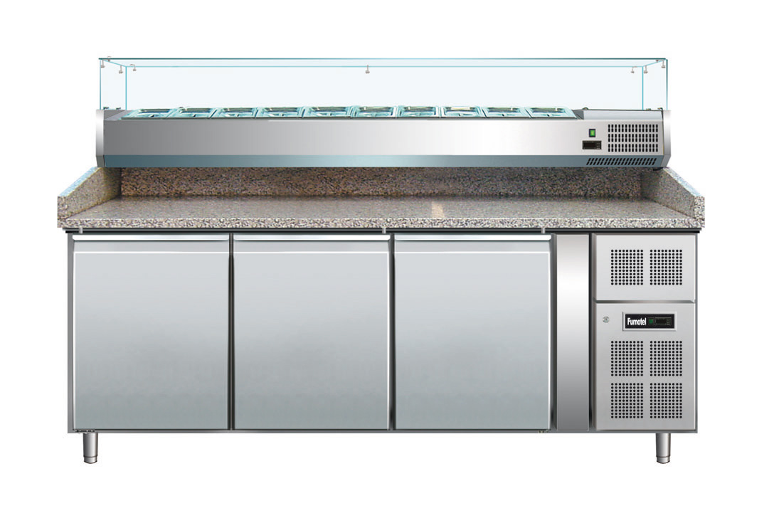 Table à pizza réfrigérée 3 portillons Vitrine réfrigérée capacité 5 bacs GN 1/3 + 1 bac GN 1/2, prof. 150 mm, livré sans bacs. Dessus granit avec dosserets arrière et latéraux. Froid ventilé, température -2°C +8°C,- Groupe tropicalisé. Gaz réfrigérant R134a Tout inox, sauf arrière Affichage digital, isolation 50 mm Dégivrage et réévaporation automatiques