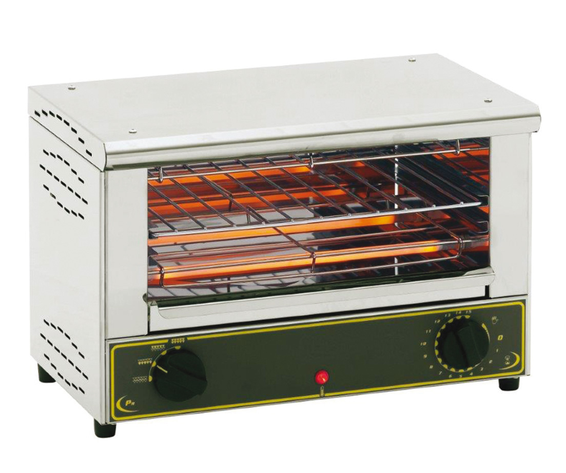Toaster infrarouge à 1 niveau. Pas de préchauffage. Cuisson à coeur sans fumée ni odeur grâce aux rayonnements des quartz infrarouges (1050°C). Sélection indépendante des quartz infrarouges. Montée rapide en température en 20 secondes. Entretien aisé : paroi arrière amovible. Équipement : commutateur, minuterie 15 avec position dutilisation en continu, voyant, poignée amovible. Livré dorigine avec des grilles protège tubes (système