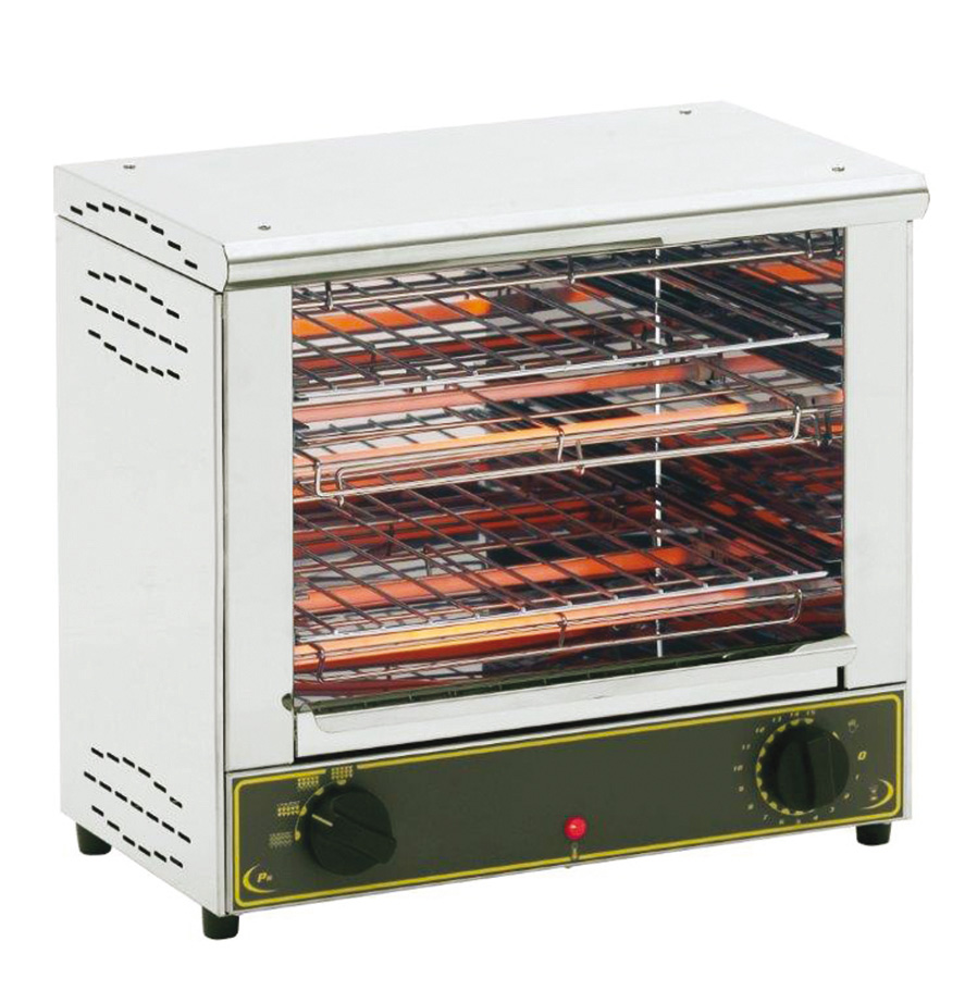 Toaster infrarouge à 2 niveaux. Pas de préchauffage. Cuisson à coeur sans fumée ni odeur grâce aux rayonnements des quartz infrarouges (1050°C). Sélection indépendante des quartz infrarouges. Montée rapide en température en 20 secondes. Entretien aisé : paroi arrière amovible. Équipement : commutateur, minuterie 15 avec position dutilisation en continu, voyant, poignée amovible. Livré dorigine avec des