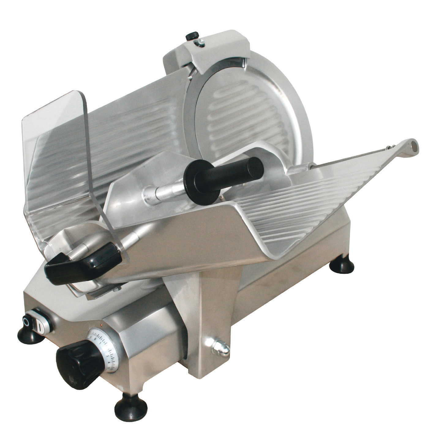 Construction italienne en aluminium anodisé. Entraînement par courroie. Moteur ventilé de grande puissance. Lame en acier trempé chromée. Anneau de sécurité protège lame « CE ». Affûteur aluminium incorporé. Réglage de lépaisseur de coupe de 0 à 16 mm. Mise en marche / arrêt par bouton poussoir basse tension IP67.