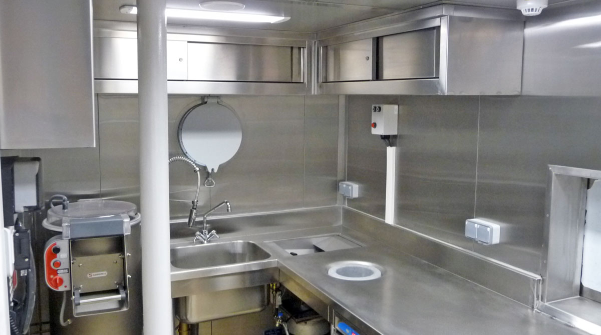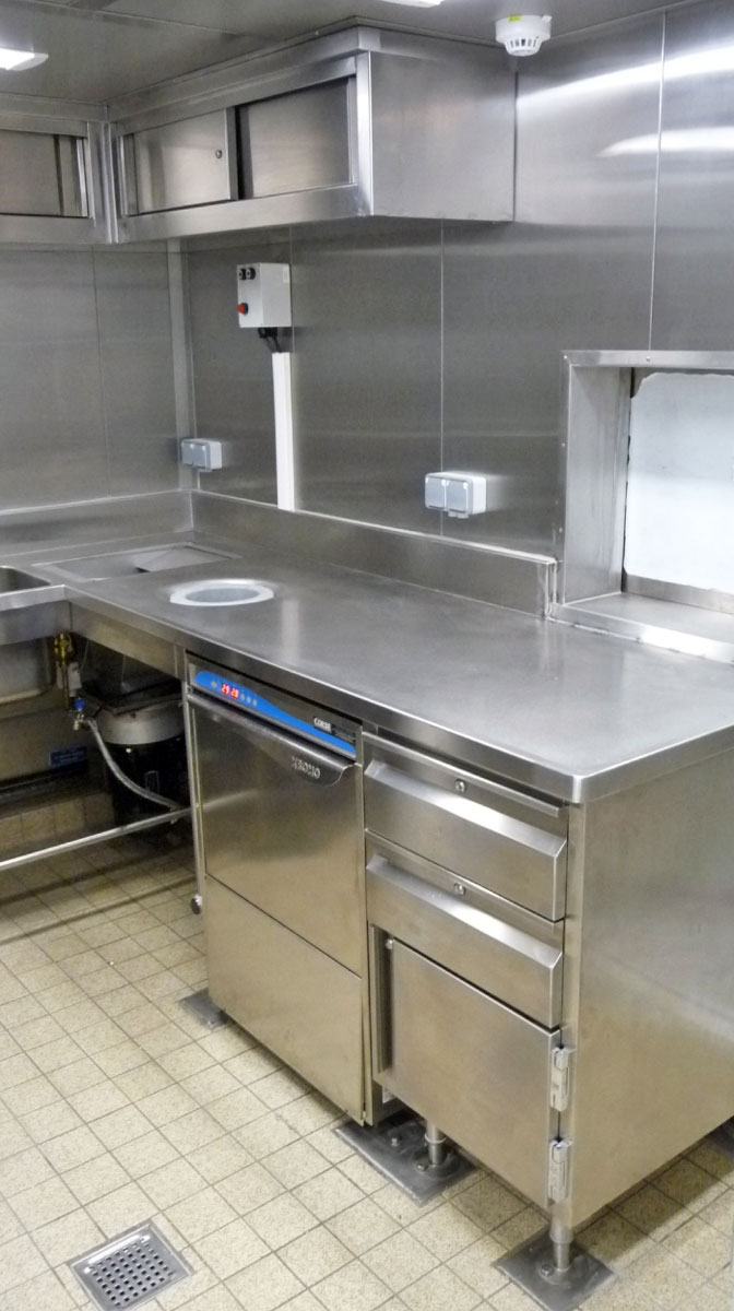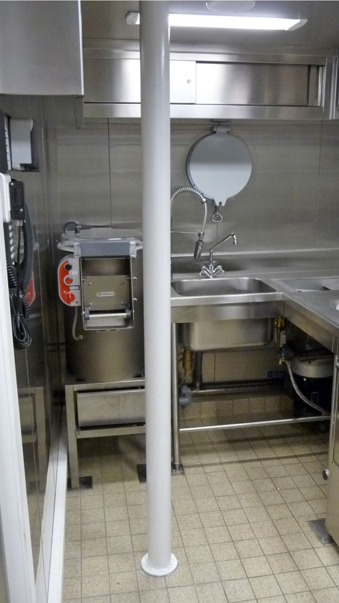 Après la cuisine sur route, nous avons élaboré en juillet 2011 une nouvelle cuisine dans un lieu singulièrement restreint : un navire en mer ! À bord du patrouilleur OPV 70 BIR ANZARAINE, nous avons en effet pensé une cuisine adaptée au conditions d’utilisation en mer. Plus précisément, les matériels sont fixés au sol, murs et plafonds et pourvus de blocage au niveau des portes et des matériels de cuisson.